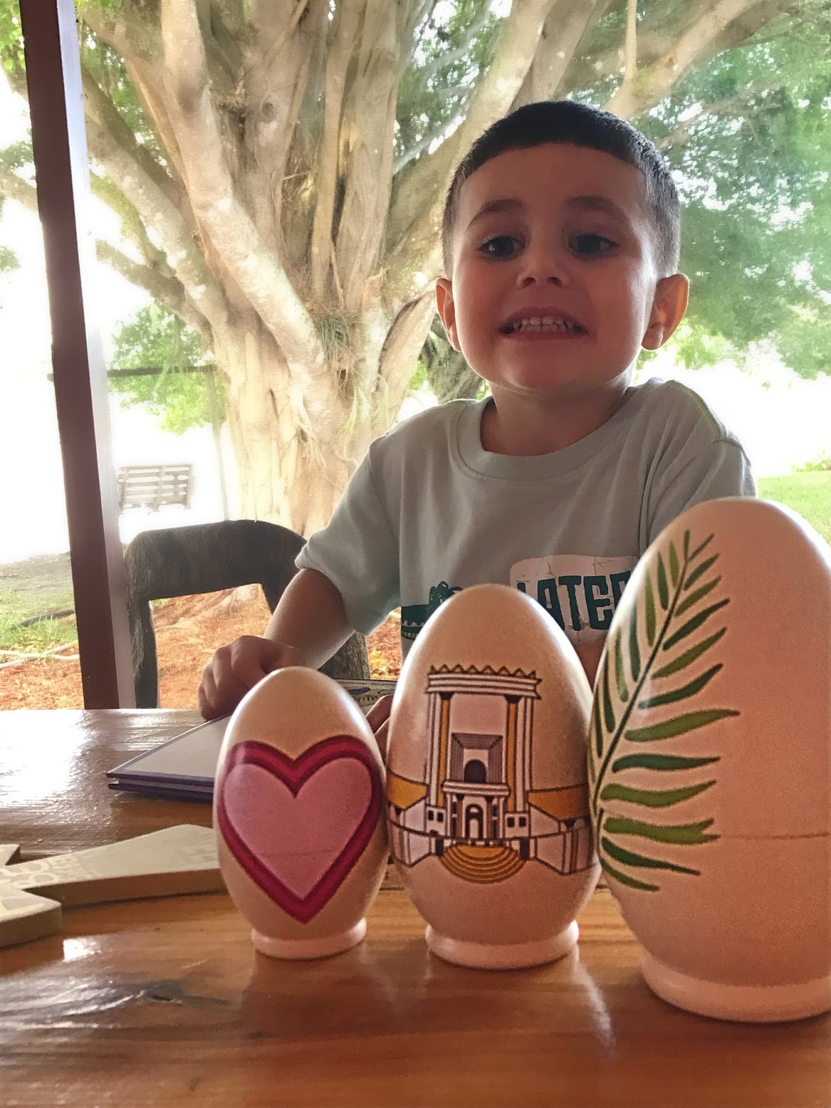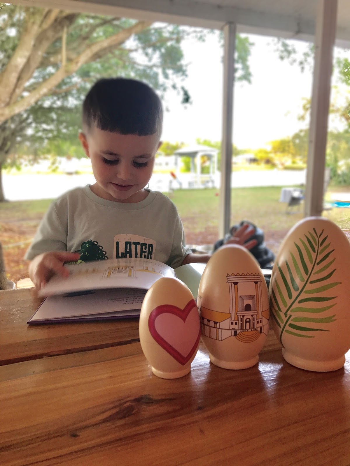 Matthew started taking apart the eggs one by one each time with pure excitement and joy, “There’s another one, and another one!” he smiled and admired all the eggs lined up, I explained to him starting Palm Sunday after church we will begin the story and each day he will be able to open one more egg, he is filled with excitement and looking forward to hearing each part of the story. I love looking at the world though his eyes it helps me stop and remember that life doesn’t always have to be so busy and hectic its about the little things like reading my baby a book and seeing him smile that really fills the heart!